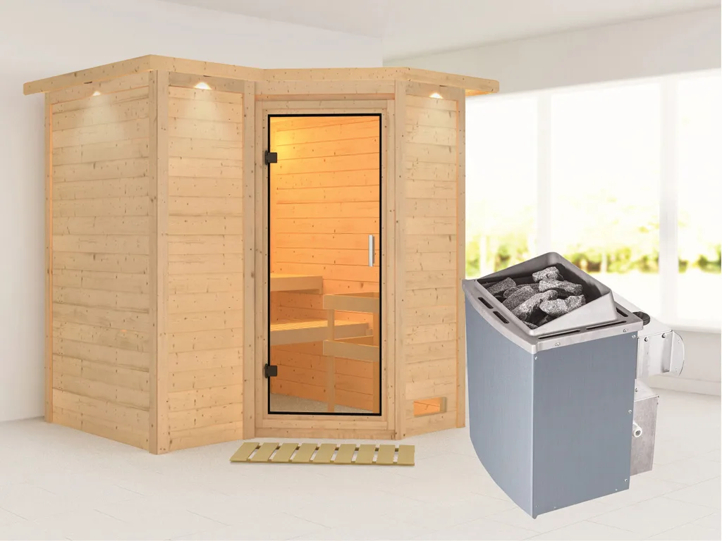 Sauna Massivholzsauna Sahib 1 mit Dachkranz, Klarglas Ganzglastür + 9 kW Saunaofen mit Steuerung