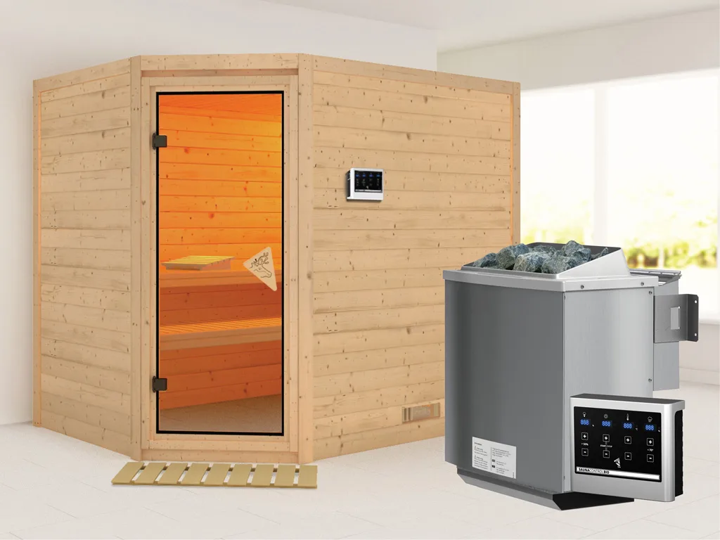3 Liegen, Ofenschutzgitter aus stabilem Fichtenholz, 1 Kopfstütze aus Espenholz, 9 kW Bio-Kombiofen mit externer Steuerung, Montageanleitung.