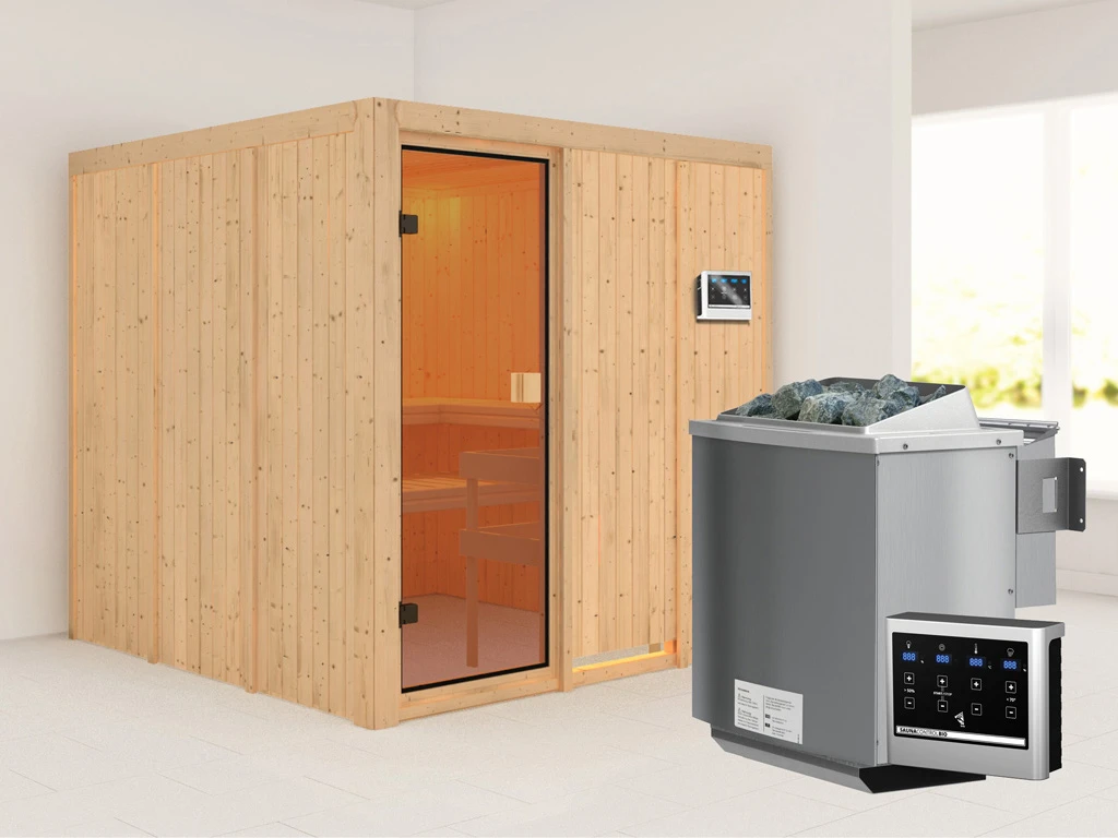 Sauna OULU mit bronzierter Glastür + 9 kW Bio-Kombiofen mit ext. Strg.