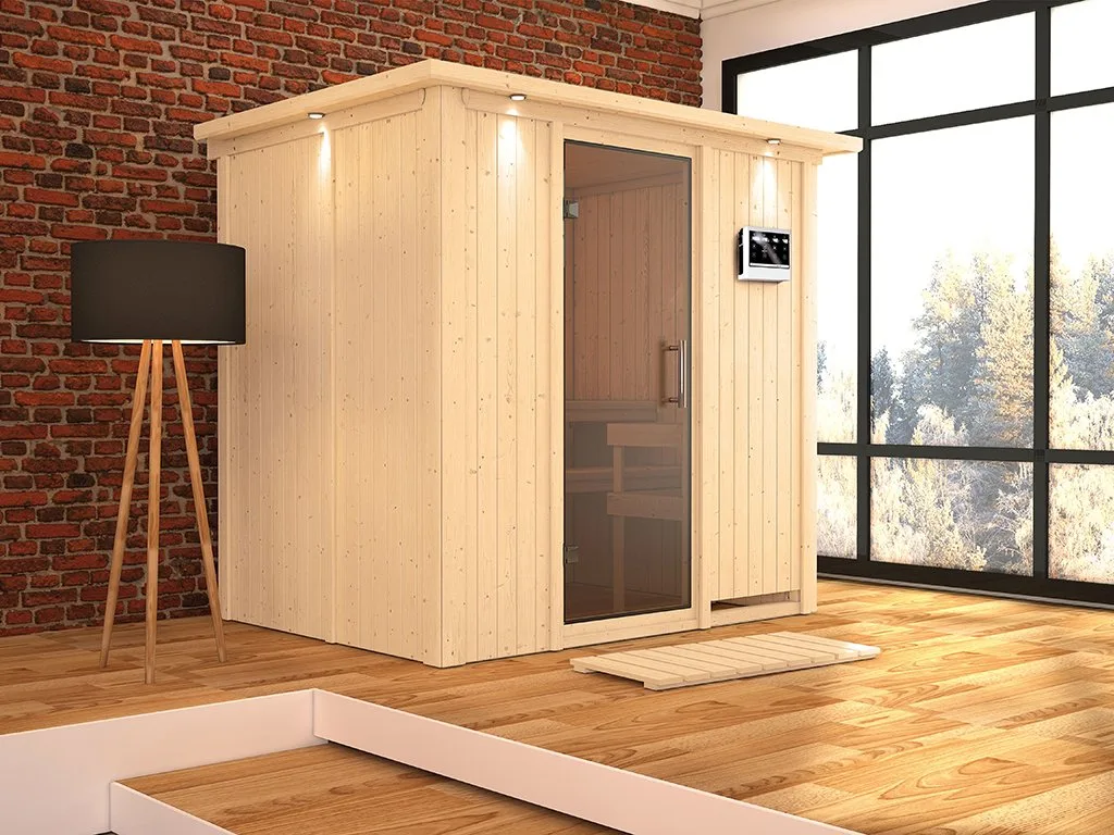 Sauna Systemsauna Bodin mit Dachkranz, inkl. 9 kW Bio-Ofen mit externer Steuerung
