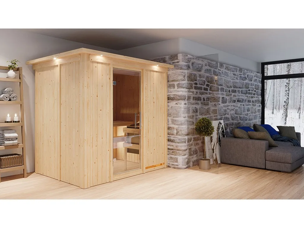 Sauna Systemsauna Bodin mit Dachkranz, inkl. 9 kW Ofen mit integrierter Steuerung