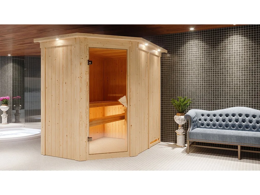 Sauna Systemsauna Carin mit Dachkranz, inkl. 9 kW Ofen mit integrierter Steuerung