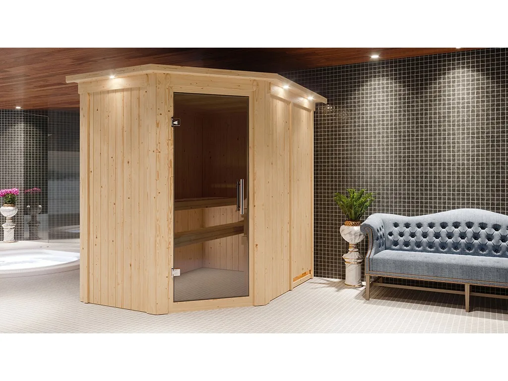 Sauna Systemsauna Carin mit Dachkranz, inkl. 9 kW Ofen mit integrierter Steuerung