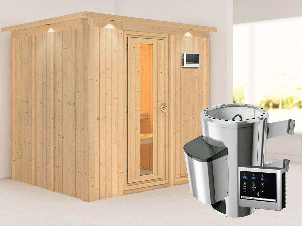 Diese Innensauna wird mit Saunaofen und einer externen Steuerung geliefert. Die Anbringung des Steuergerätes erfolgt an der Außenseite der Sauna. Ganz komfortabel kann somit die Saunasteuerung von außen erledigt und die Temperatur exakt bestimmt werden. Zusätzlich verfügt das Steuergerät über eine Anschlussstelle, über die ein weiteres elektrisches Gerät bedient werden kann.