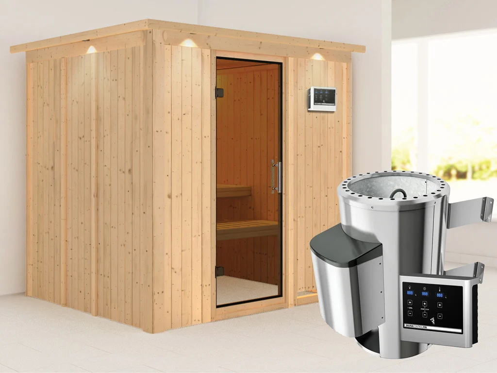 Diese Innensauna wird mit Saunaofen und einer externen Steuerung geliefert. Die Anbringung des Steuergerätes erfolgt an der Außenseite der Sauna. Ganz komfortabel kann somit die Saunasteuerung von außen erledigt und die Temperatur exakt bestimmt werden. Zusätzlich verfügt das Steuergerät über eine Anschlussstelle, über die ein weiteres elektrisches Gerät bedient werden kann.