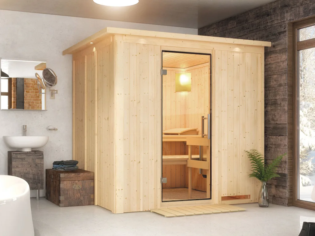 Dieses Saunamodell – eine System- bzw. Elementsauna – zeichnet sich durch seine besondere Sandwich-Bauweise aus, d.h. die Wandelemente bestehen aus einzelnen Schichten. Die bereits vorgefertigten Wandelemente ermöglichen einen schnellen Aufbau innerhalb weniger Stunden.