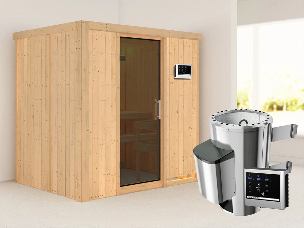 Diese Innensauna wird mit Saunaofen und einer externen Steuerung geliefert. Die Anbringung des Steuergerätes erfolgt an der Außenseite der Sauna. Ganz komfortabel kann somit die Saunasteuerung von außen erledigt und die Temperatur exakt bestimmt werden. Zusätzlich verfügt das Steuergerät über eine Anschlussstelle, über die ein weiteres elektrisches Gerät bedient werden kann.