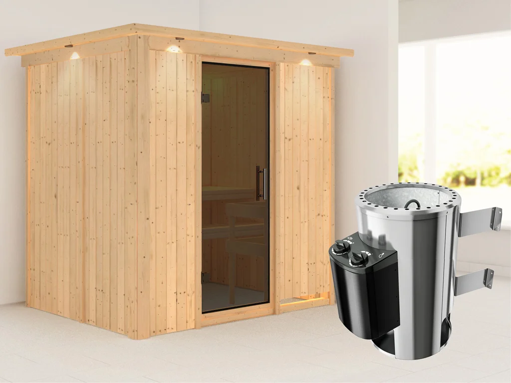 Bei dieser Sauna ist ein Saunaofen mit integrierter Steuerung inklusive. Die Steuerung ist direkt am Ofen verbaut und lässt sich durch praktische und robuste Drehschalter besonders leicht bedienen. Die preisgünstige Variante der Saunasteuerung vereint alles in einem – Ofen und integrierte Steuerung.