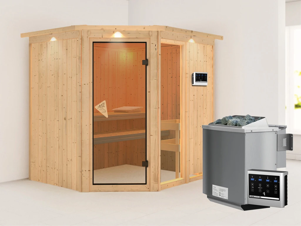 Diese Innensauna wird einschließlich Saunaofen mit externer Steuerung geliefert. Die Anbringung an der Außenseite der Sauna ermöglicht eine praktische Bedienung vor dem Saunieren und eine noch exaktere Einstellung der Temperatur. Weitere elektrische Geräte, wie eine Kabinenbeleuchtung, können ebenso an die externe Steuerung angeschlossen und mit dieser bedient werden.