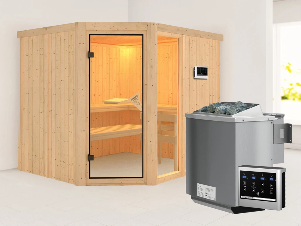 Diese Innensauna wird einschließlich Saunaofen mit externer Steuerung geliefert. Die Anbringung an der Außenseite der Sauna ermöglicht eine praktische Bedienung vor dem Saunieren und eine noch exaktere Einstellung der Temperatur. Weitere elektrische Geräte, wie eine Kabinenbeleuchtung, können ebenso an die externe Steuerung angeschlossen und mit dieser bedient werden.