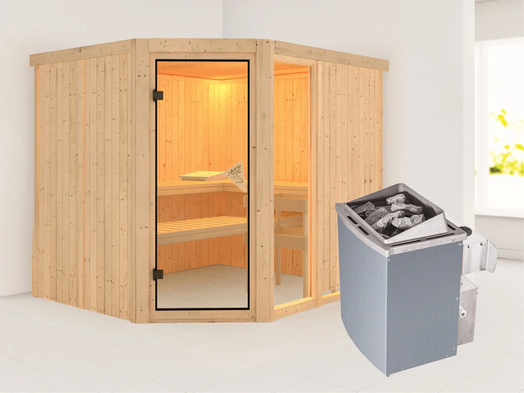 3 Liegen, Ofenschutzgitter aus stabilem Fichtenholz, 1 Kopfstütze aus Espenholz, 9 kW Ofen mit integrierter Steuerung, Montageanleitung.