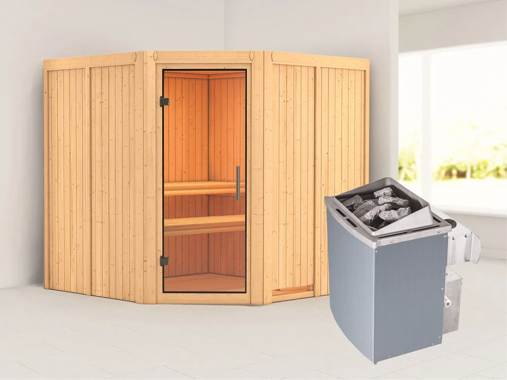 3 Liegen, 9 kW Saunaofen, int. Steuerung, Kopfstütze, Ofenschutzgitter, Montageanleitung.