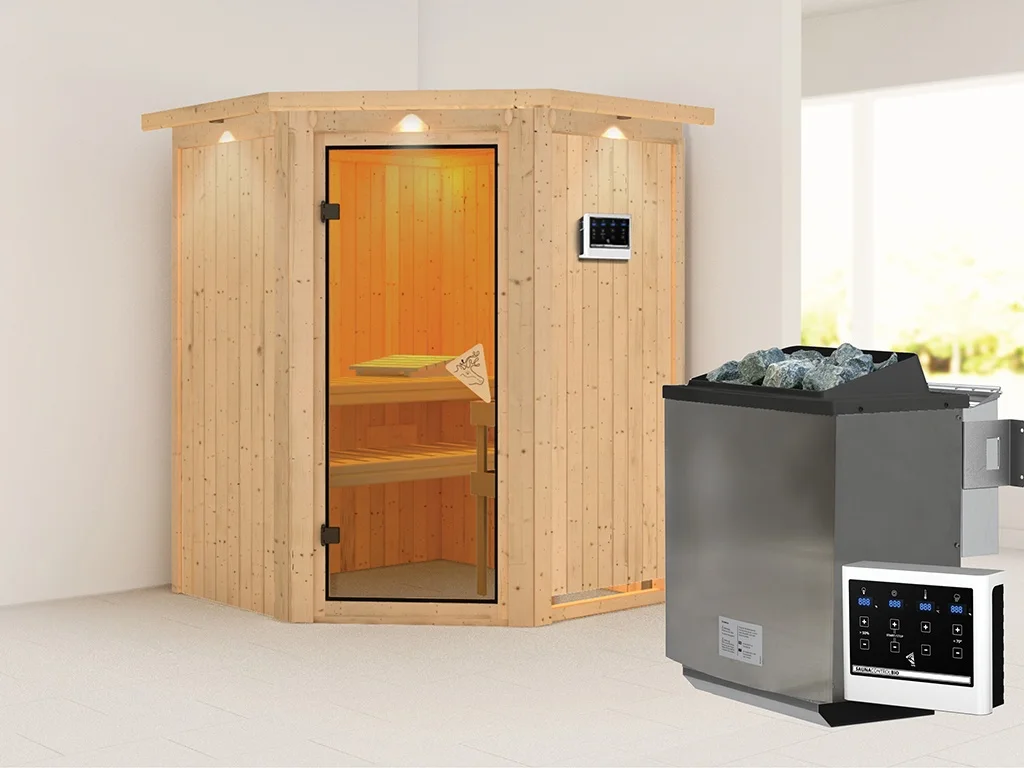 Sauna Systemsauna Larin mit Dachkranz, inkl. 9 kW Bio-Ofen mit externer Steuerung