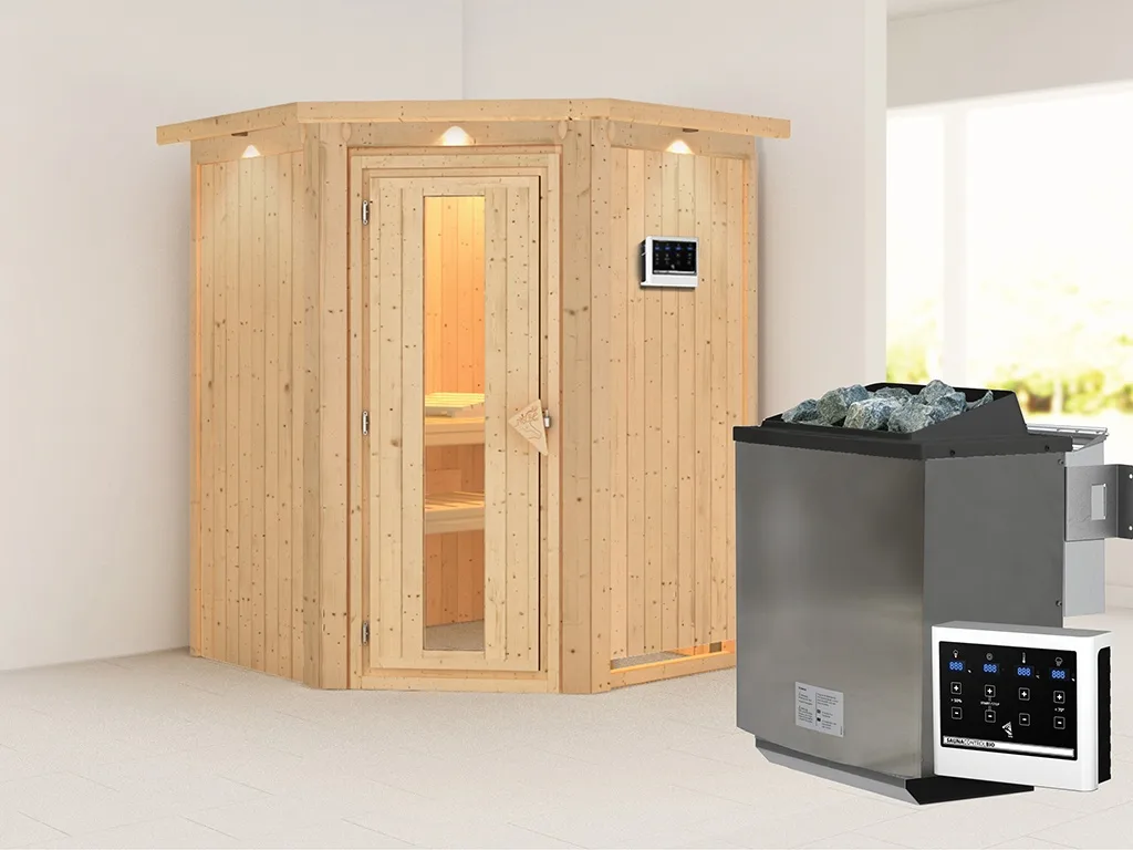Sauna Systemsauna Larin mit Dachkranz, inkl. 9 kW Bio-Ofen mit externer Steuerung