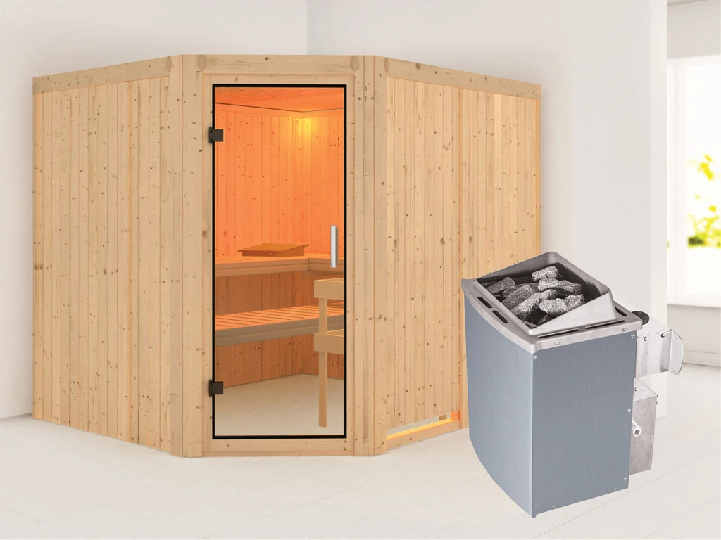 3 Liegen, 9 kW Saunaofen, int. Steuerung, Kopfstütze, Ofenschutzgitter, Montageanleitung.
