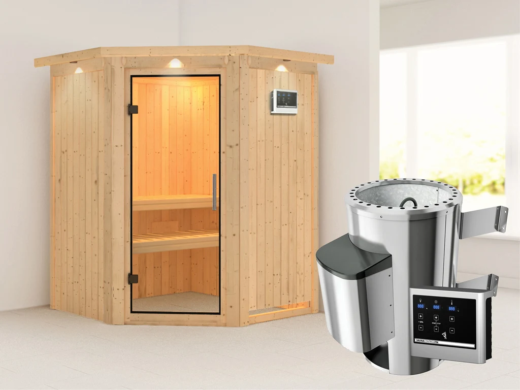 Diese Innensauna wird mit Saunaofen und einer externen Steuerung geliefert. Die Anbringung des Steuergerätes erfolgt an der Außenseite der Sauna. Ganz komfortabel kann somit die Saunasteuerung von außen erledigt und die Temperatur exakt bestimmt werden. Zusätzlich verfügt das Steuergerät über eine Anschlussstelle, über die ein weiteres elektrisches Gerät bedient werden kann.