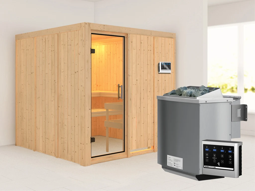 9 kW Bio-Kombiofen, ext. Steuerung, 3 Liegen, Kopfstütze, Ofenschutzgitter, Montageanleitung.