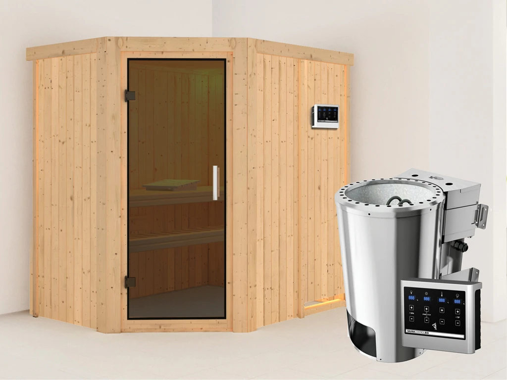 Diese Innensauna wird mit Saunaofen und einer externen Steuerung geliefert. Die Anbringung des Steuergerätes erfolgt an der Außenseite der Sauna. Ganz komfortabel kann somit die Saunasteuerung von außen erledigt und die Temperatur exakt bestimmt werden. Zusätzlich verfügt das Steuergerät über eine Anschlussstelle, über die ein weiteres elektrisches Gerät bedient werden kann.