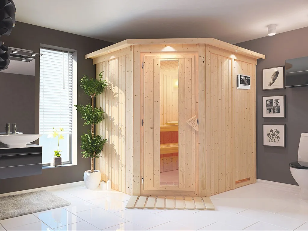 Sauna Systemsauna Siirin mit Dachkranz, inkl. 9 kW Bio-Ofen mit externer Steuerung
