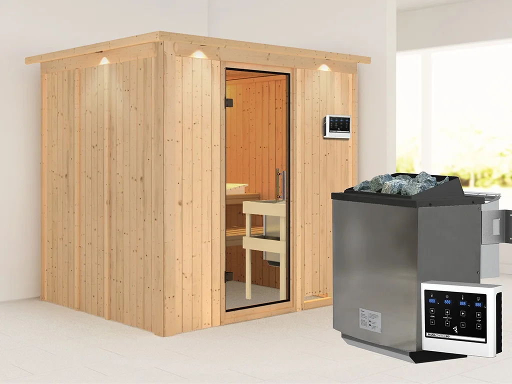Sauna Systemsauna Sodin mit Dachkranz, inkl. 9 kW Bio-Ofen mit externer Steuerung