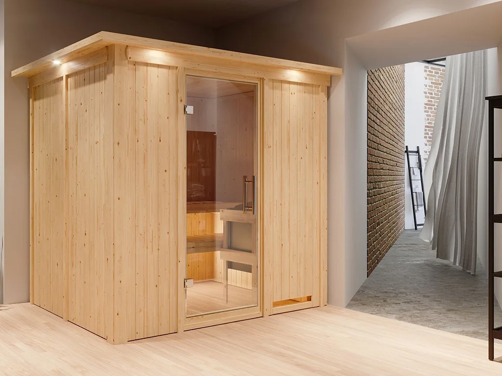 Sauna Systemsauna Sodin mit Dachkranz, inkl. 9 kW Ofen mit integrierter Steuerung