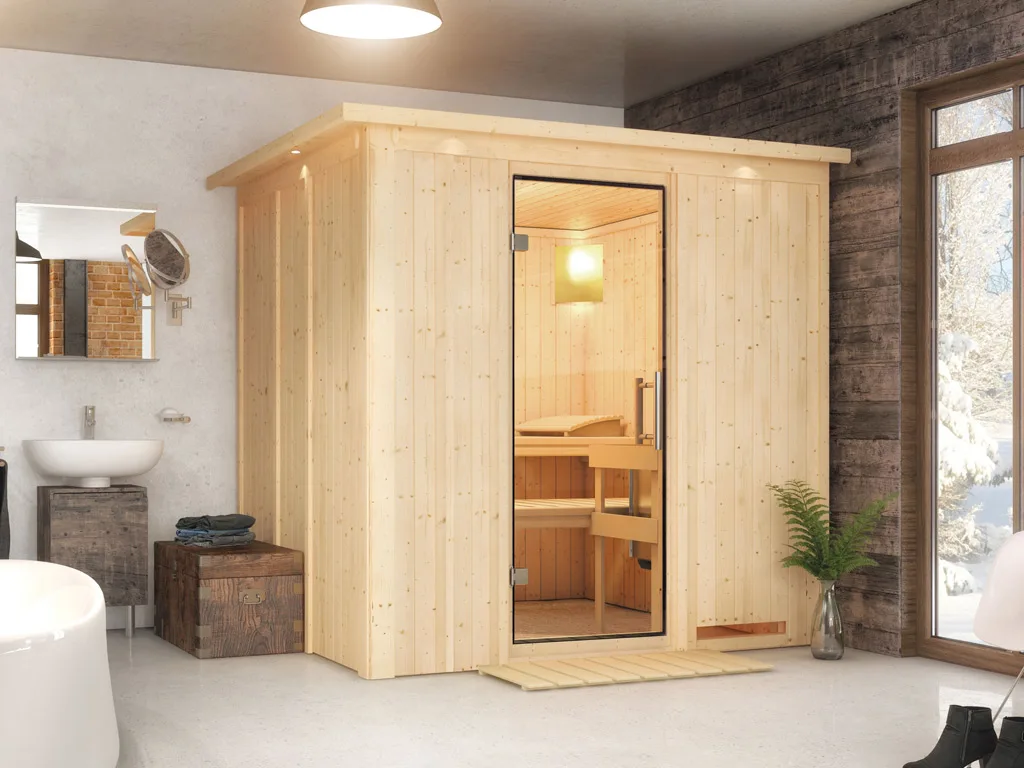 Dieses Saunamodell – eine System- bzw. Elementsauna – zeichnet sich durch seine besondere Sandwich-Bauweise aus, d.h. die Wandelemente bestehen aus einzelnen Schichten. Die bereits vorgefertigten Wandelemente ermöglichen einen schnellen Aufbau innerhalb weniger Stunden.