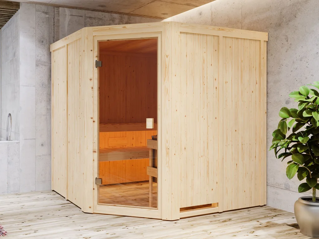 Dieses Saunamodell – eine Systemsauna – zeichnet sich durch seine besondere Sandwich-Bauweise aus, d.h. die Wandelemente bestehen aus einzelnen Schichten. Die bereits vorgefertigten Wandelemente ermöglichen einen schnellen Aufbau innerhalb weniger Stunden.