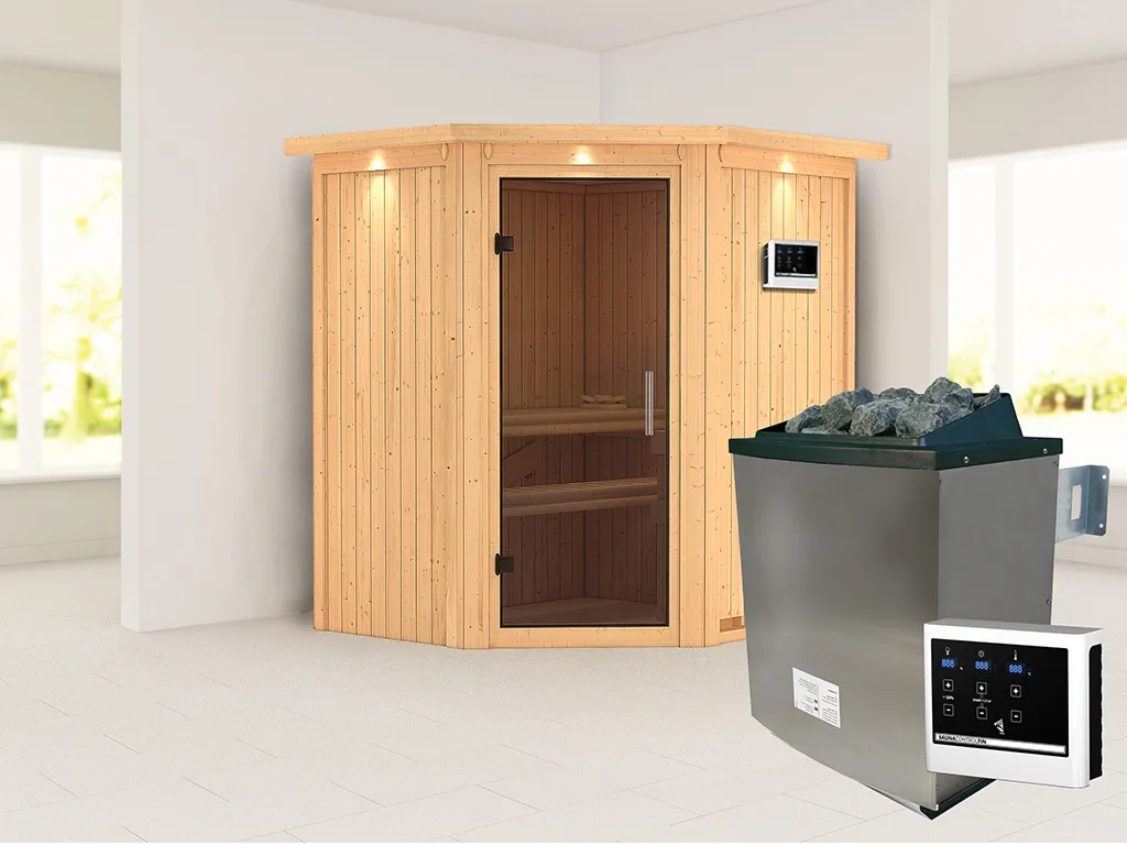 Sauna Systemsauna Taurin mit Dachkranz, inkl. 9 kW Ofen mit externer Steuerung