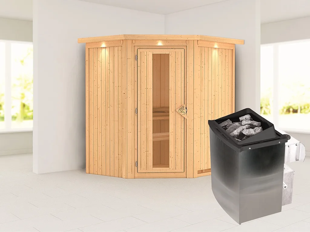 Sauna Systemsauna Taurin mit Dachkranz, inkl. 9 kW Ofen mit integrierter Steuerung