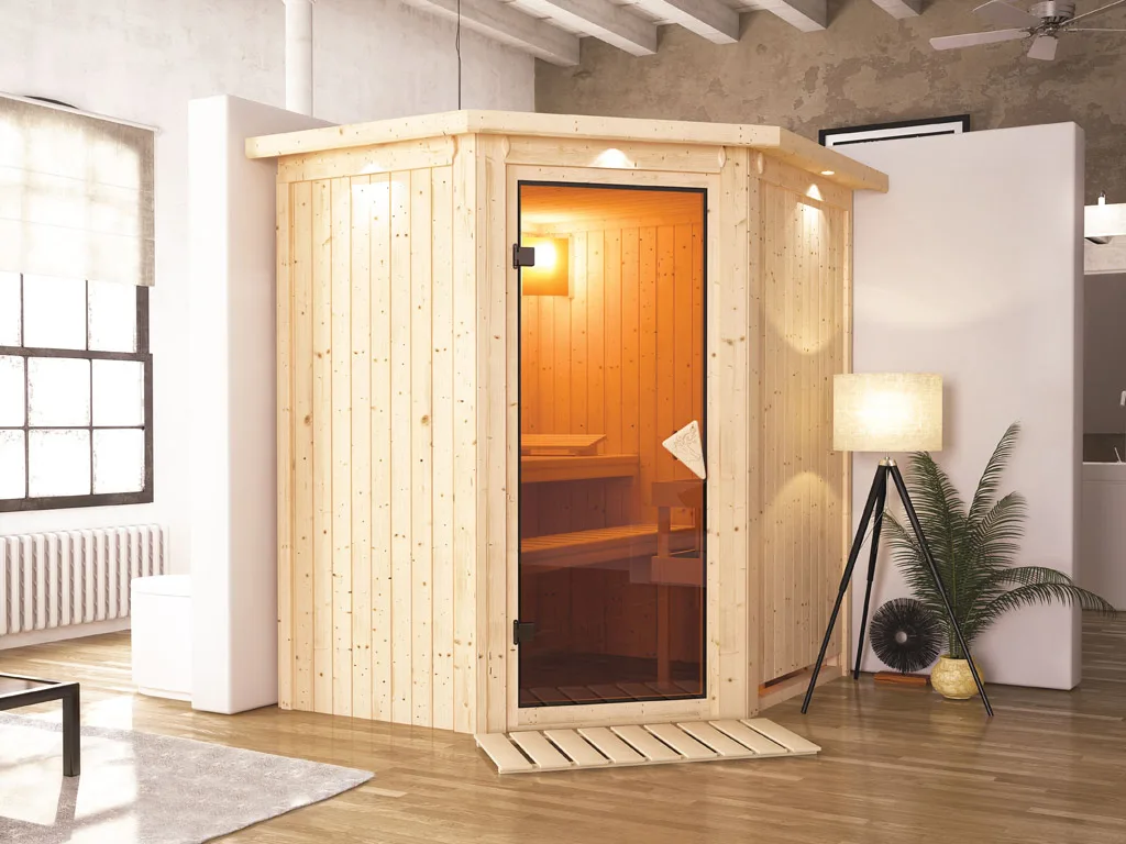 Bei der Montage einer Sauna muss ein Mindestabstand von 10 cm zu Wänden und Decke unbedingt eingehalten werden, um gute Luftzirkulation zu gewährleisten. So kann feucht-warme Luft besser abziehen. In diesem Zusammenhang müssen die Mindestraumhöhe und -breite beachtet werden.