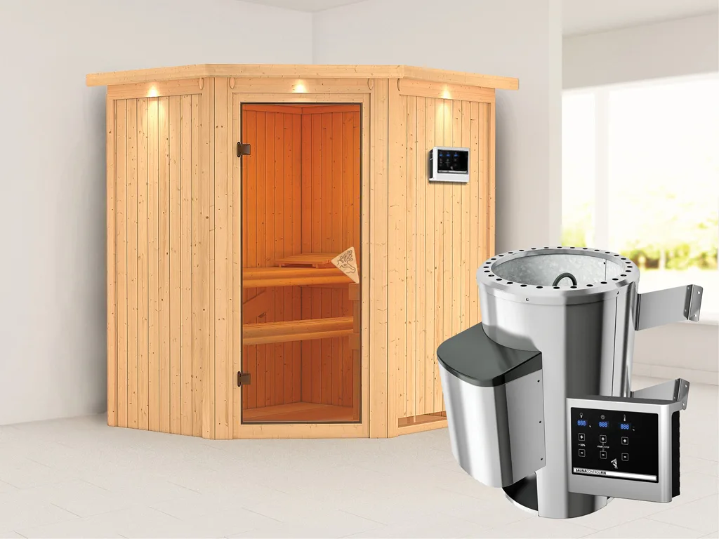 Diese Innensauna wird einschließlich Saunaofen mit externer Steuerung geliefert. Die Anbringung an der Außenseite der Sauna ermöglicht eine praktische Bedienung vor dem Saunieren und eine noch exaktere Einstellung der Temperatur. Weitere elektrische Geräte, wie eine Kabinenbeleuchtung, können ebenso an die externe Steuerung angeschlossen und mit dieser bedient werden.