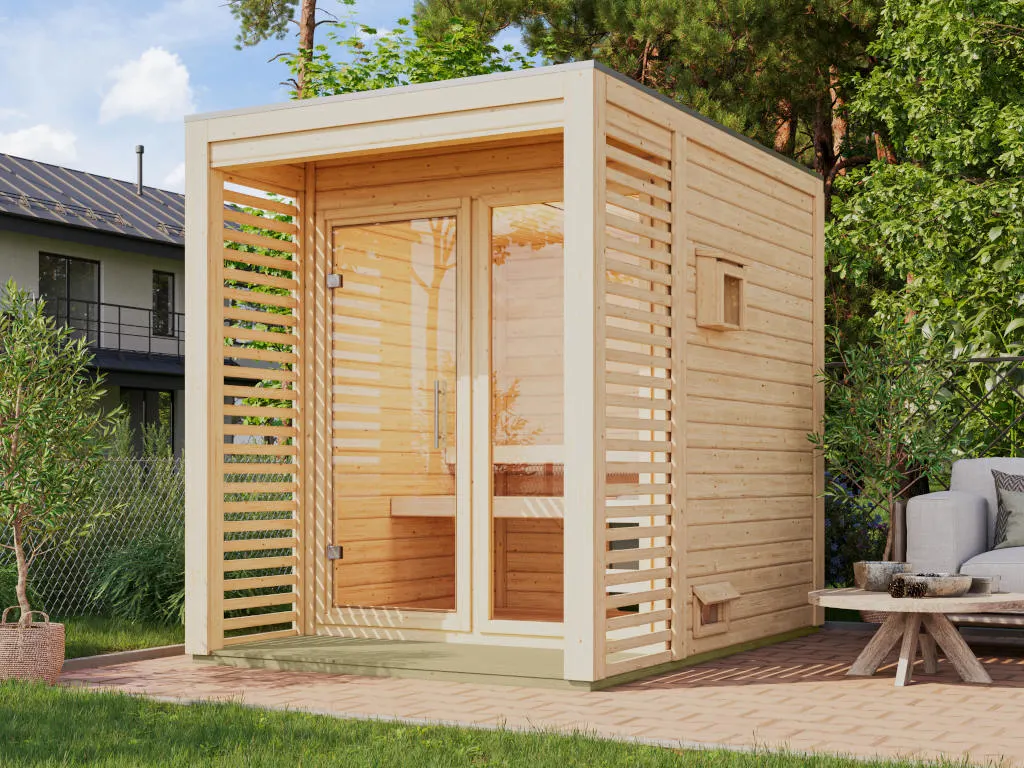 Das Saunahaus aus 38 mm starken Wandbrettern aus Fichte wird im Steck-/Schraubsystem montiert. Mit einem Gesamtmaß von 191 x 276 cm bietet es genügend Platz für ungestörte Wellnessstunden im eigenen Garten. Der Saunaraum ist mit einer Fläche von 179 x 184 cm natürlich ebenfalls ausreichend dimensioniert.