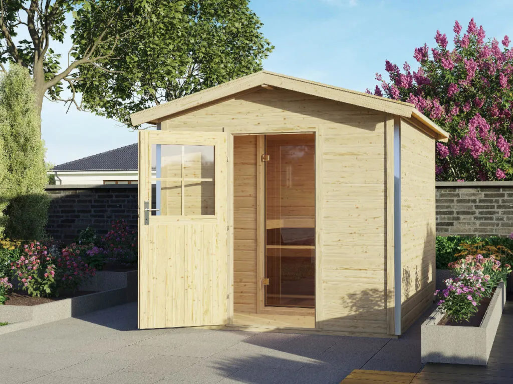 Erlebe pure Entspannung mit deiner Gartensauna: Hochwertige Materialien und attraktives Design sorgen für ein einzigartiges Saunaerlebnis direkt in deinem Garten. Der Saunaraum ist mit einer Fläche von 219 x 261 cm ausreichend dimensioniert. Hier können 3-4 Personen gleichzeitig saunieren.