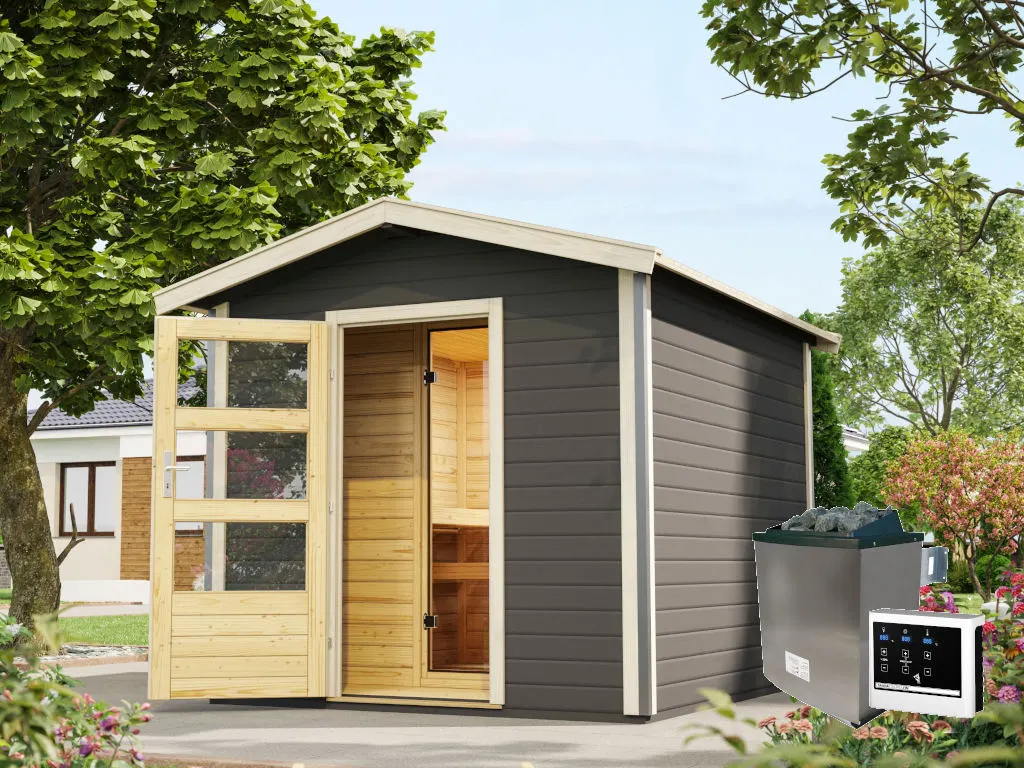 Saunahaus Bosse 1 terragrau 38 mm inkl. klassischer Saunaofen 9 kW + ext. Steuerung