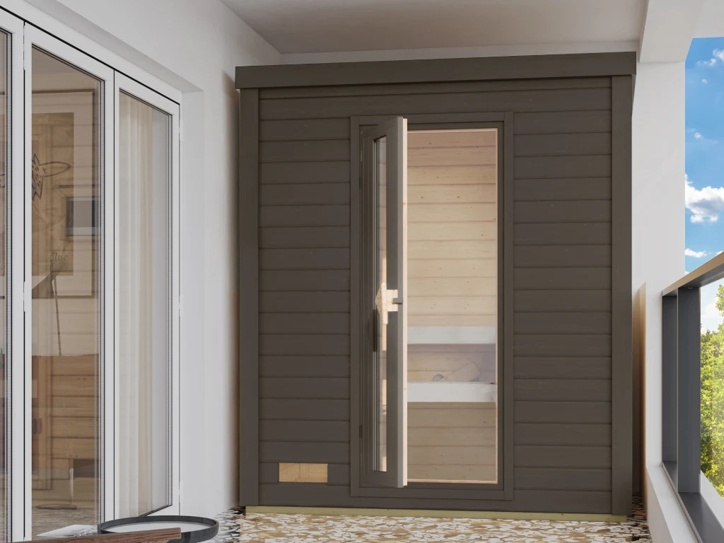 Der Fronteinstieg dieser Sauna unterstützt den traditionellen Charakter und ist ein gern gesehener Klassiker. Das Eintreten von vorne schafft Übersicht und Klarheit.