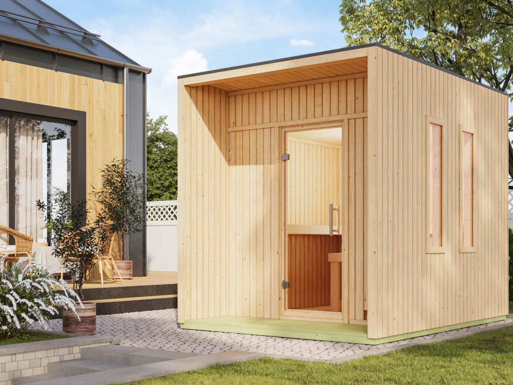Diese Elementsauna verdankt ihren Namen den einzelnen vorgefertigten Wandelementen, die beim Aufbau einfach nur zusammengesteckt werden. Das ermöglicht einen schnellen und einfachen Aufbau. Die innenliegende Kabelführung garantiert mehr Sicherheit beim Anschluss des Saunaofens, der Systemsteuerung und weiterem Zubehör. Die vorgefertigten Wände bestehen aus 73 mm starken Massivholzelementen, die aus langsam wachsendem nordischem Fichtenholz angefertigt werden. Die passgenaue Verarbeitung der handverlesenen massiven Blockbohlen mit Doppelnut und Feder sorgt für die langjährige Stabilität.