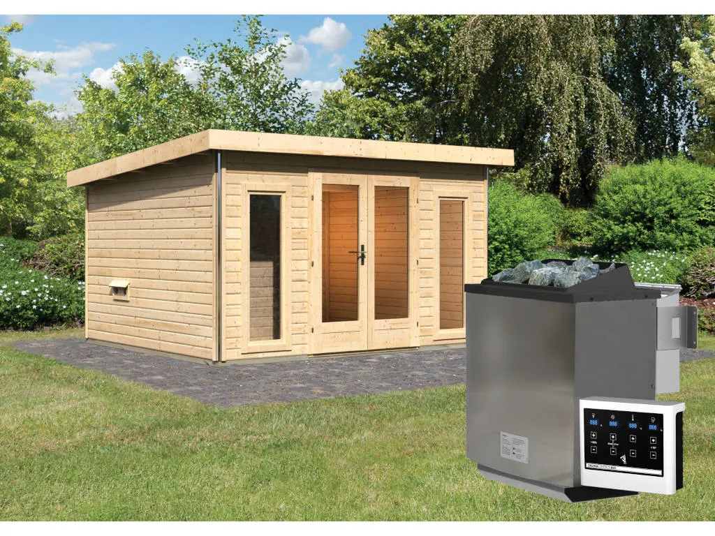 KARIBU Saunahaus Mainburg 2 naturbelassen 38 mm inkl. Bio-Kombiofen 9 kW + ext. Steuerung