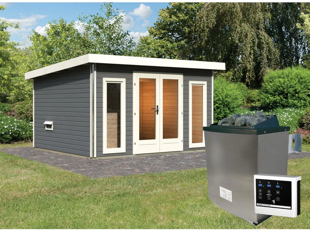 KARIBU Saunahaus Mainburg 2 terragrau 38 mm inkl. Bio-Kombiofen 9 kW + ext. Steuerung