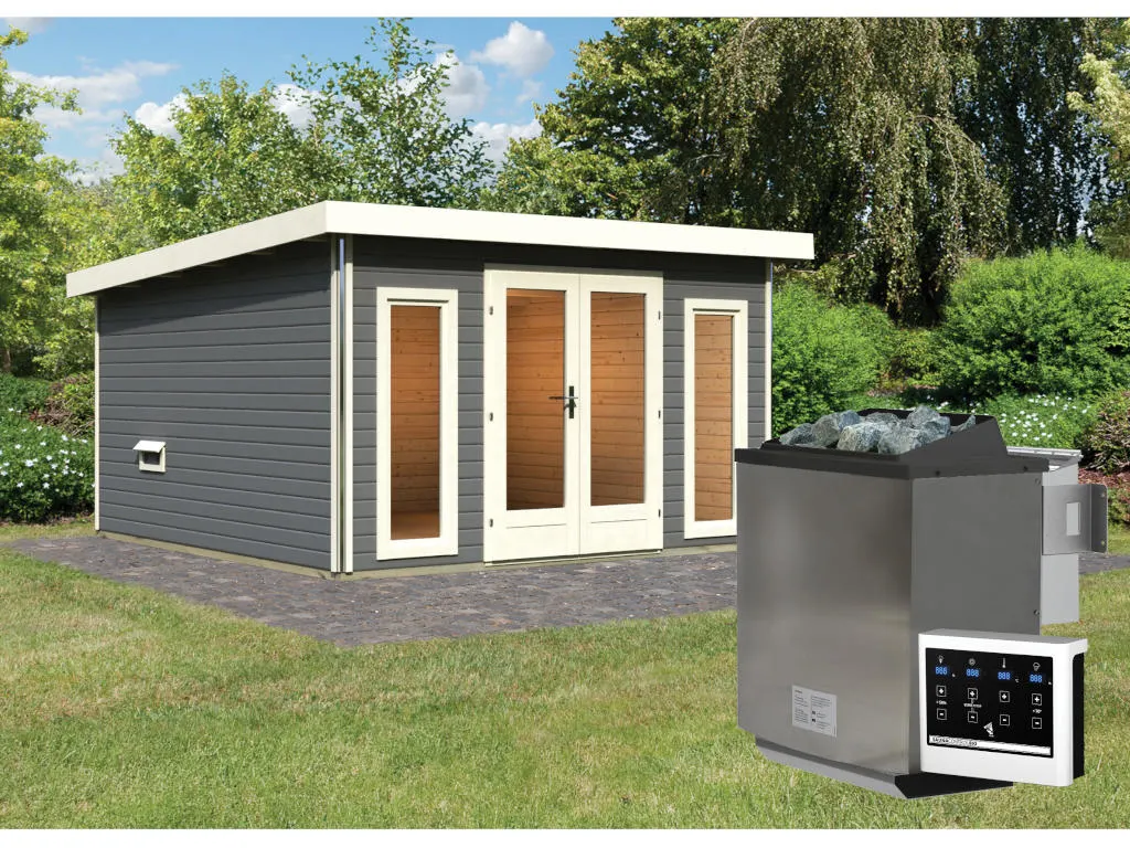 KARIBU Saunahaus Mainburg 3 terragrau 38 mm inkl. Bio-Kombiofen 9 kW + ext. Steuerung