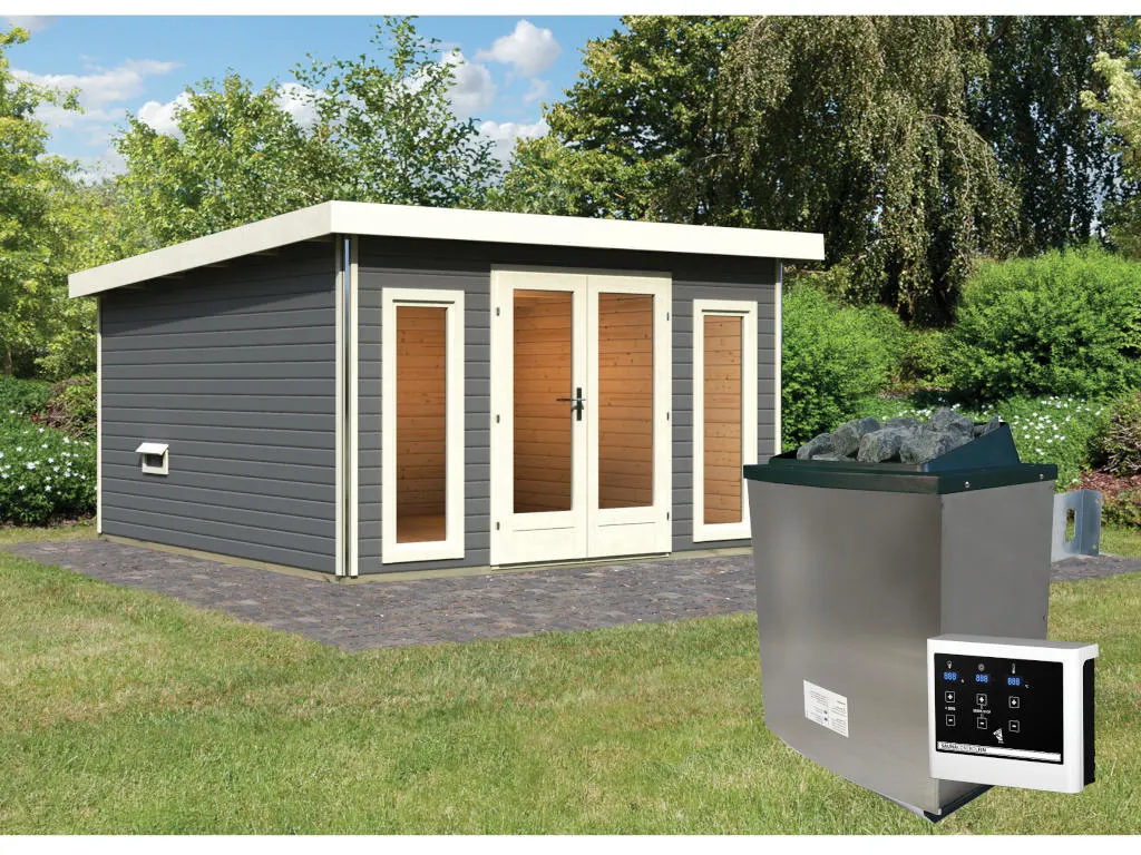 KARIBU Saunahaus Mainburg 3 terragrau 38 mm inkl. klassischer Saunaofen 9 kW + ext. Steuerung