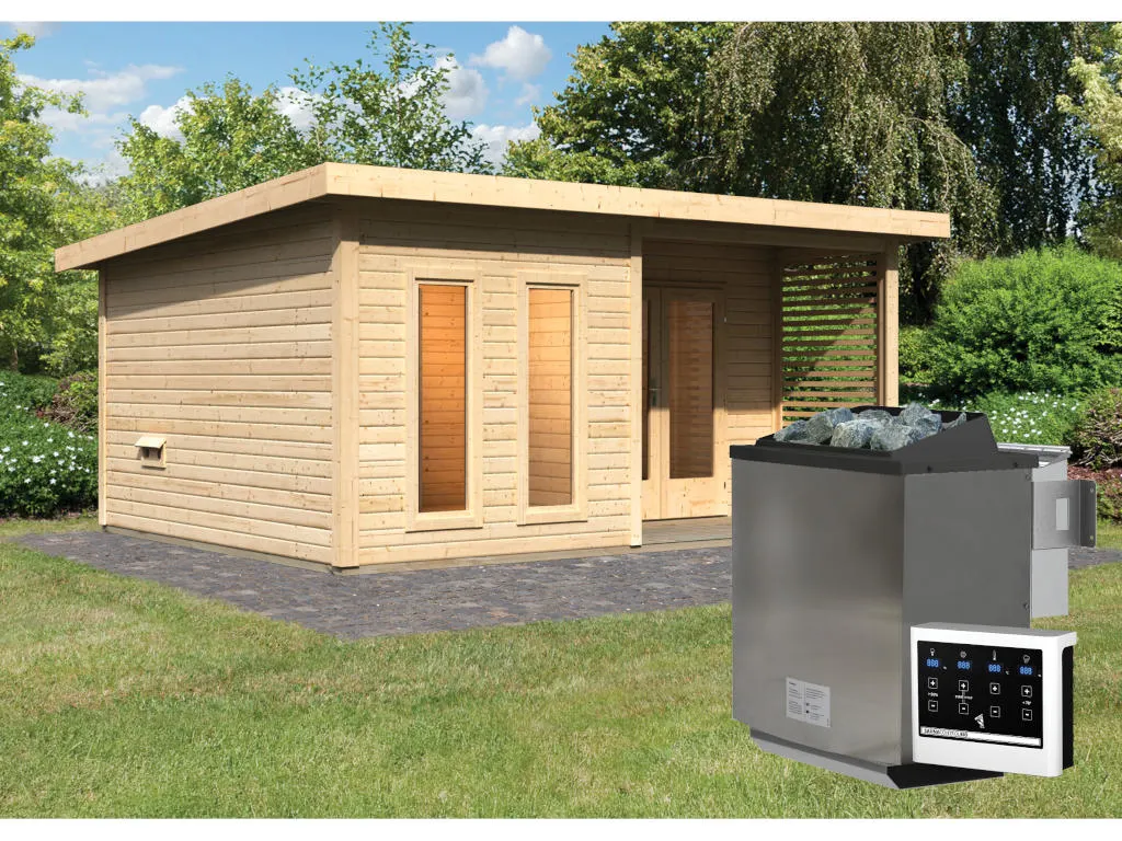 KARIBU Saunahaus Mainburg 5 naturbelassen 38 mm inkl. Bio-Kombiofen 9 kW + ext. Steuerung