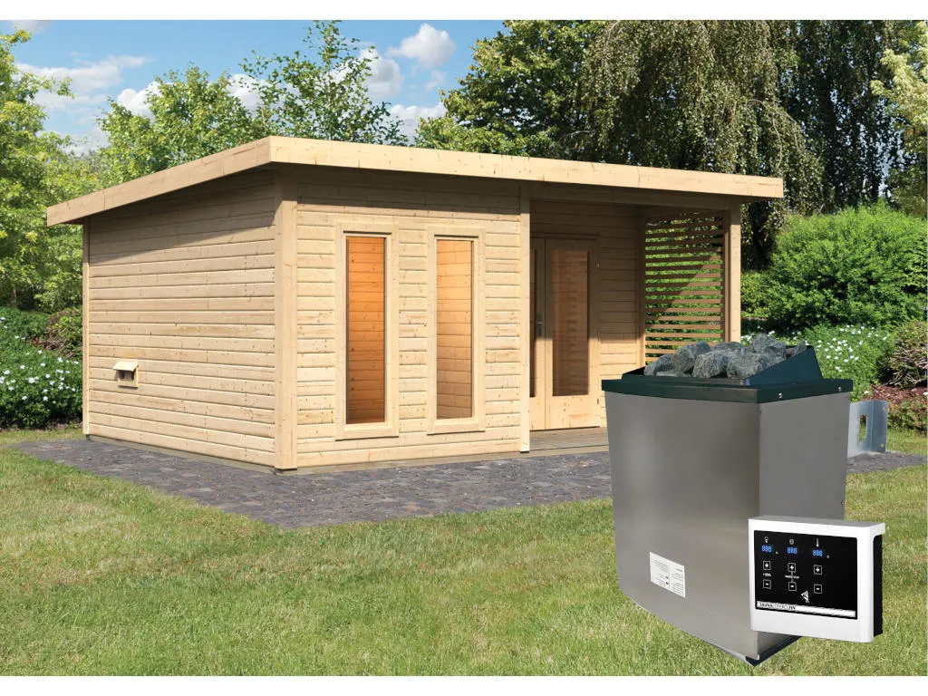 KARIBU Saunahaus Mainburg 5 naturbelassen 38 mm inkl. klassischer Saunaofen 9 kW + ext. Steuerung