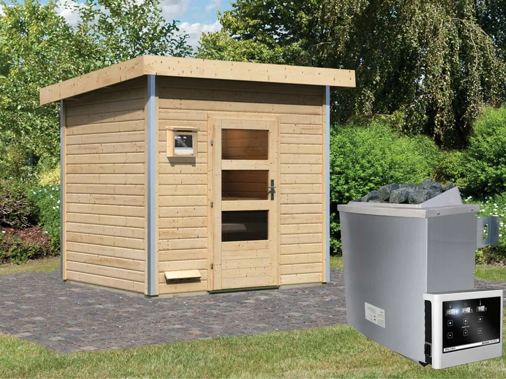 Saunahaus Norge mit Klarglastür, inkl. 9 kW Saunaofen mit externer Steuerung