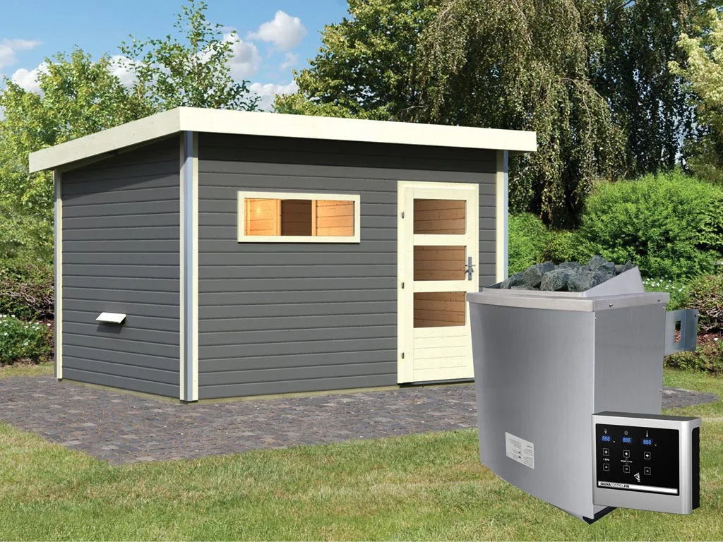 Saunahaus Skrollan 3 mit moderner Tür terragrau + 9 kW Saunaofen ext. Strg.