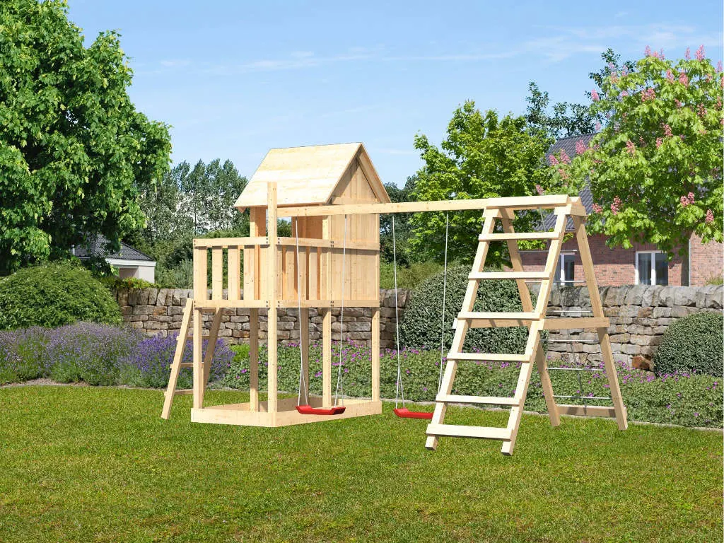 Der Spielturm hat 68 x 68 mm starke Massivholzpfosten, welche Auflage für das Satteldach bieten. Die Grundfläche (Basis-Turm) von 107 x 107 cm und die Firsthöhe von 291 cm sind der Ausdruck von Qualität. Nordische Fichte aus dem hohen Norden Europas ist der Grundstoff für diese Qualität. Das dort aufgrund von härteren klimatischen Bedingungen langsam wachsende Holz bildet engstehende Jahresringe und sorgt dafür, dass das Fichtenholz härter als mitteleuropäisches Nadelholz ist. Die 4 Pfosten des Grundturmes werden mittels Schaukelankern im Untergrund befestigt.