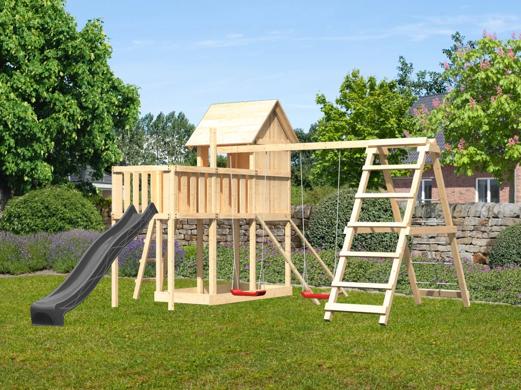 Spielturm Frieda naturbelassen inkl. Rutsche anthrazit + Doppelschaukel + Anbauplattform