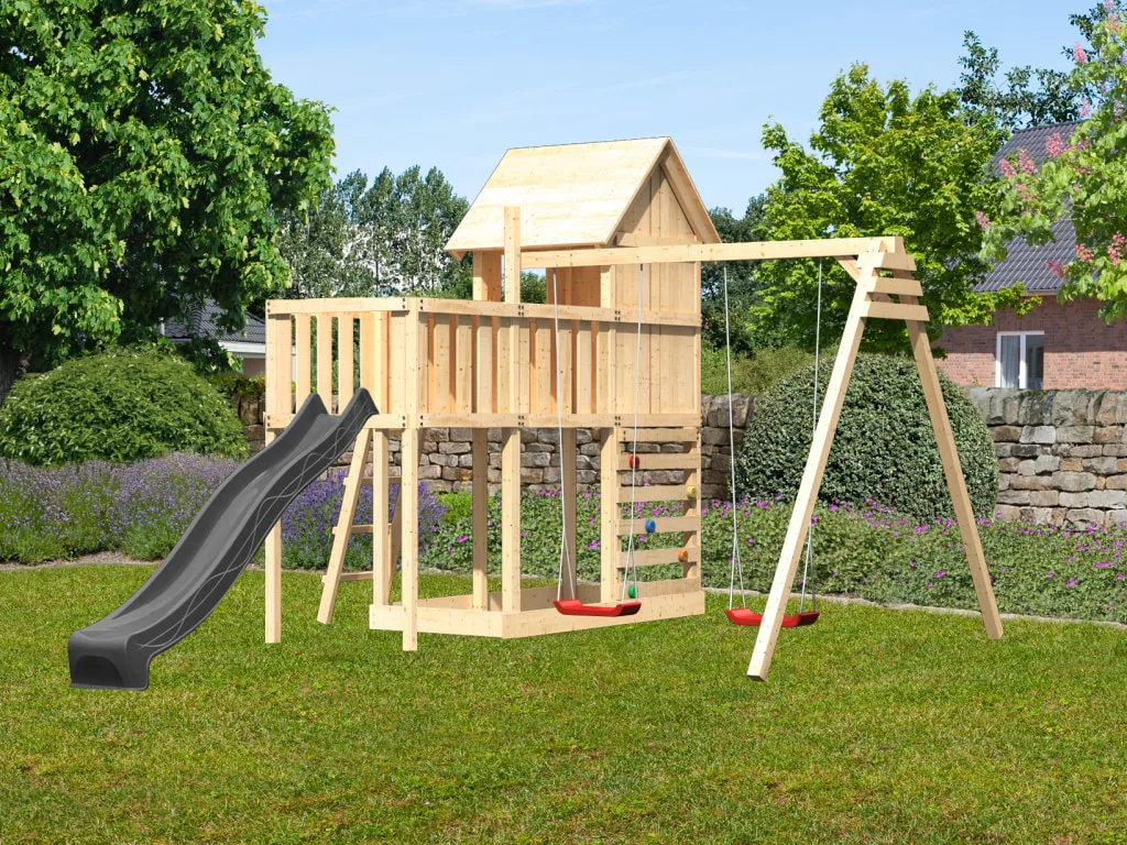 Spielturm Frieda naturbelassen inkl. Rutsche anthrazit + Doppelschaukel + Anbauplattform + Kletterwand