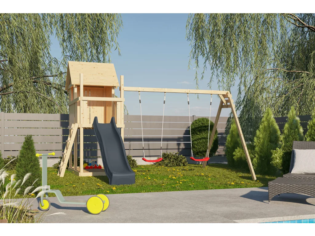 Spielturm Frieda naturbelassen inkl. Rutsche anthrazit + Doppelschaukel