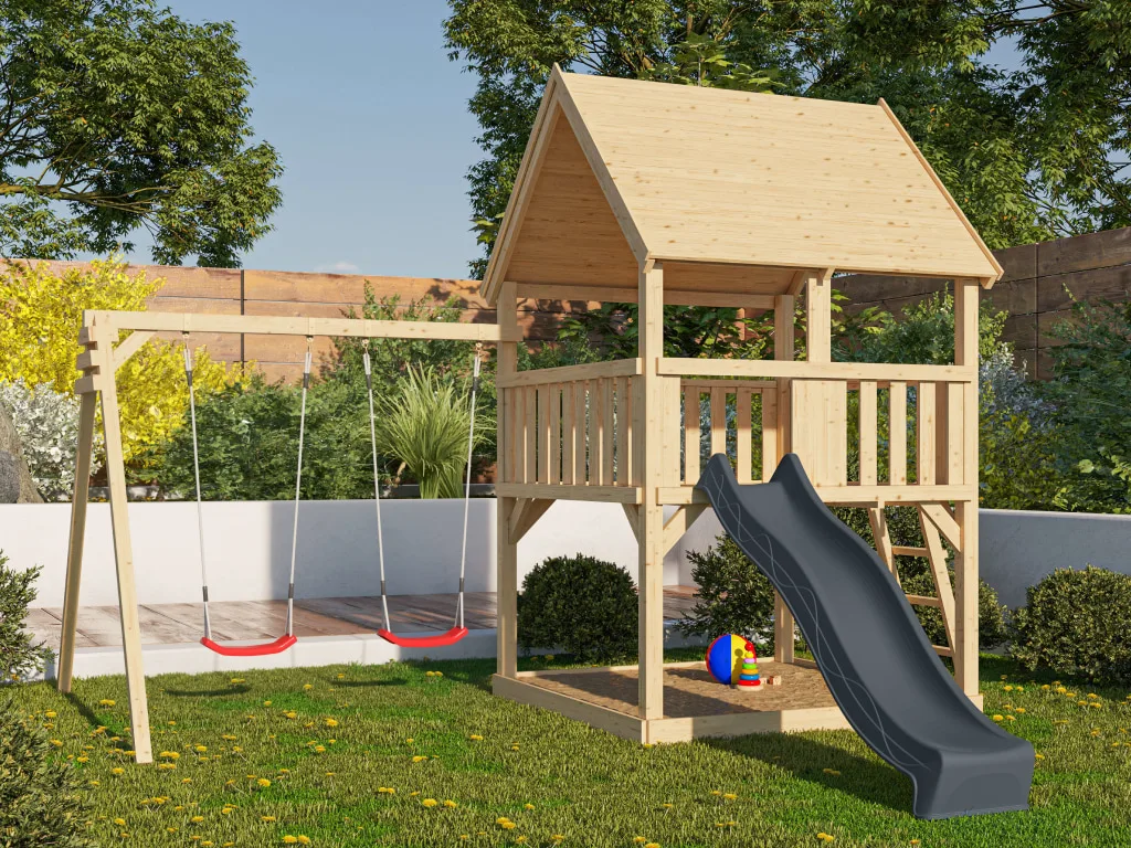 Spielturm Luis naturbelassen inkl. Rutsche anthrazit + Doppelschaukel