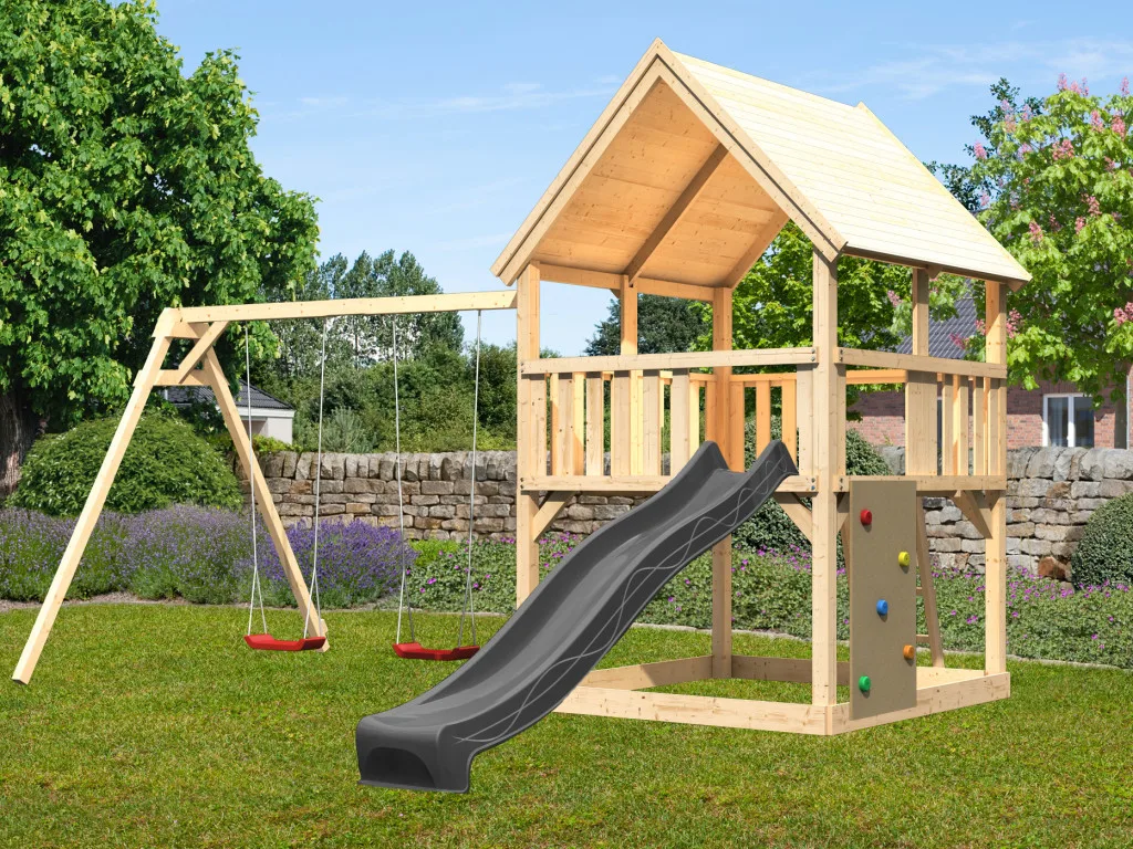 Spielturm Luis naturbelassen inkl. Rutsche anthrazit + Doppelschaukel + Kletterwand